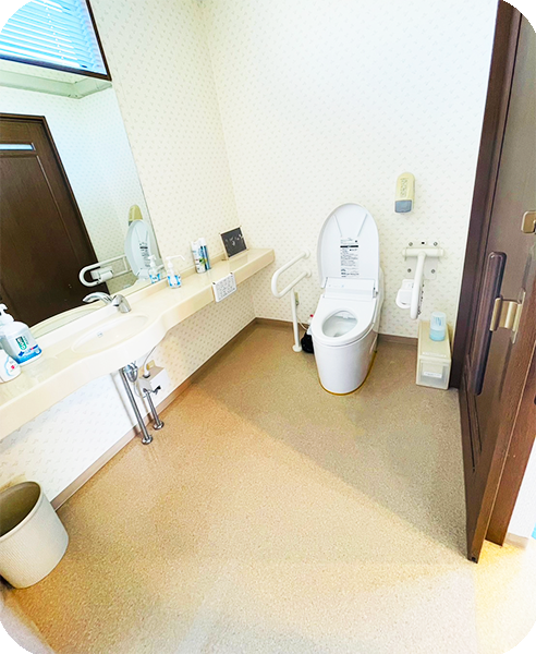 広々とした設計で、車椅子や歩行器をご利用の方はもちろん、介助者の方も一緒に入ることが可能です。また、手すりを備え、安全面にも十分配慮しています。